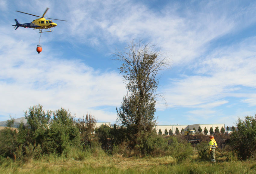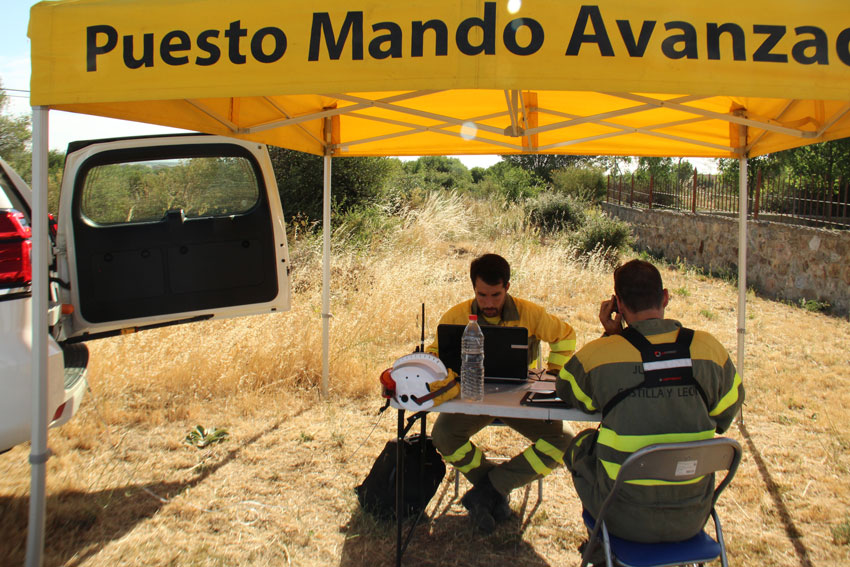 Voy añadiendo la información y sobre las 18 vuelvo a Trescasas. El acceso desde San Cristóbal esta cortado por el sur y por la carretera de Torrecaballeros. Así que tomo la carretera de Torrecaballeros y paro en la urbanización de alto copete. Justo a 100 metros de la residencia. Allí Medio Ambiente de la Junta ha montado el cuartel general. Una pareja de guardias civiles corta el paso a los vehículos, y varios sargentos y oficiales están sobre el terreno. El director del operativo, el del casco blanco, no para de dar órdenes. Los dos helicópteros cargan el rociador en el Pontón y lanzaan descargas desde poco más de 30 metros. Precisos y efectivos.