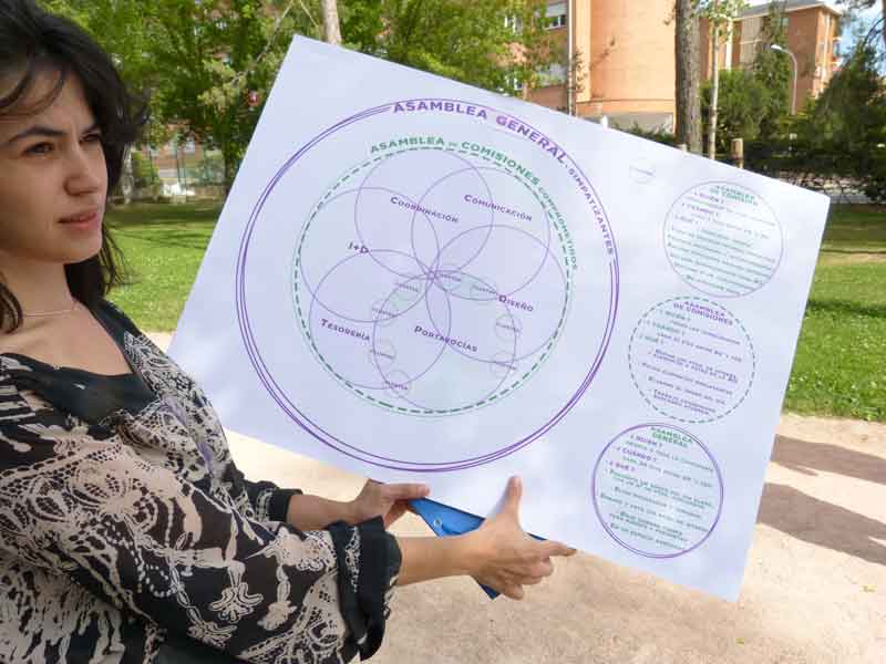 Para ello, en una suerte de tablón de círculos en forma de pétalos, la comisión de I+D de Podemos Segovia explicó su propuesta organizativa. Una asamblea general y luego comisiones, de comunicación, de coordinación, de diseño, de portavocía, de I+D, de tesorería… Cada una con una tarea por delante. Cada semana, asamblea de los portavoces de cada comisión, una suerte de ejecutiva encargada de sacar adelante el “día a día”, “los posicionamientos públicos frente a situaciones concretas. Queremos ser superoperativos”, explicaba Guillermo, de I+D. Lateralmente, “clusters”, o grupos de trabajo más reducidos y formados por especialistas a los que recurrir cuando se precisa un diagnóstico, un “cómo”. “Esta es nuestra tercera asamblea tras las elecciones, necesitamos asentarnos, relajarnos y dar respuesta a la mucha gente que nos ha votado. Tenemos una responsabilidad para con ellos”, explicaba Daniel López, portavoz.