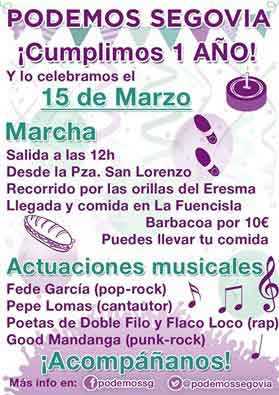 Apunten. El domingo 15, Podemos Segovia celebra su primer año de vida. Además de dedicarse a sus tradicionales sacrificios rituales, estupro de menores y Te Deums para venezualizar el mundo (¡es broma!), los morados lo celebran con lo que ya viene siendo un clásico en Segovia, marchar. Paseíto por la vereda del Eresma con conclusión en la Fuencisla. Barbacoa de 10€ (opcionalmente se puede uno llevar el bocadillo, faltaría más) y amenización a cargo de cantautor+punkrock+rapero.