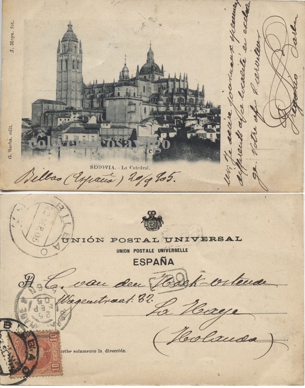La postal que reproducimos, al igual que la que aparece ilustrando dicho catálogo, está firmada por Gregorio Barba (la fecha de circulación de la cartulina que ofrecemos, con matasellos de Bilbao el 23 de septiembre de 1905 -recepcionada en La Haya dos días más tarde-; está remitida un año antes que la imagen de la cartulina que figura en el inventario de Carrasco, 6 de junio de 1906).
