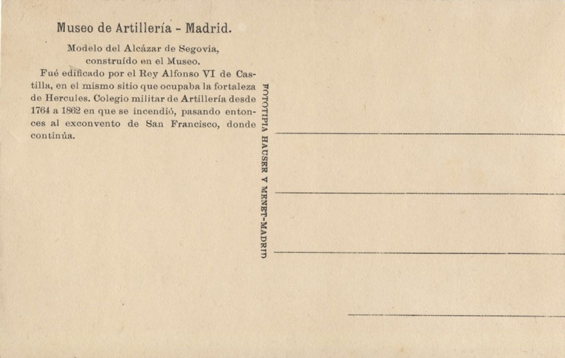 Texto de la tarjeta postal, maqueta Alcázar de Segovia del antiguo Museo de Artillería de Madrid