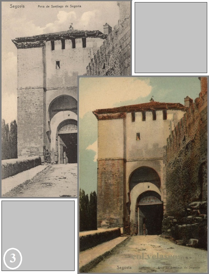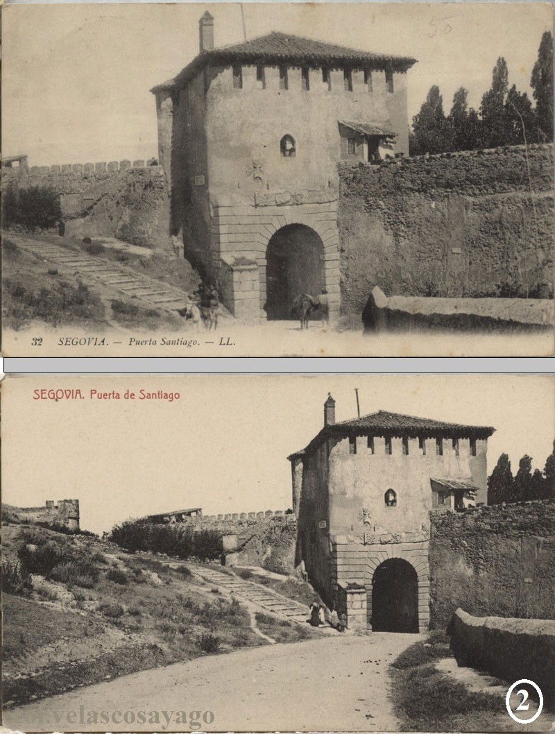 2: Postales de la colección ‘LL’ (Leon y Levy, compuesta de 45 imágenes de Segovia) nº 32: ‘Puerta de Santiago’, edición 1911 y del editor barcelonés ‘Thomas’ (36 postales de una serie general -Segovia: 250 a 285-) nº 277: ‘Puerta de Santiago’, edición 1913.
