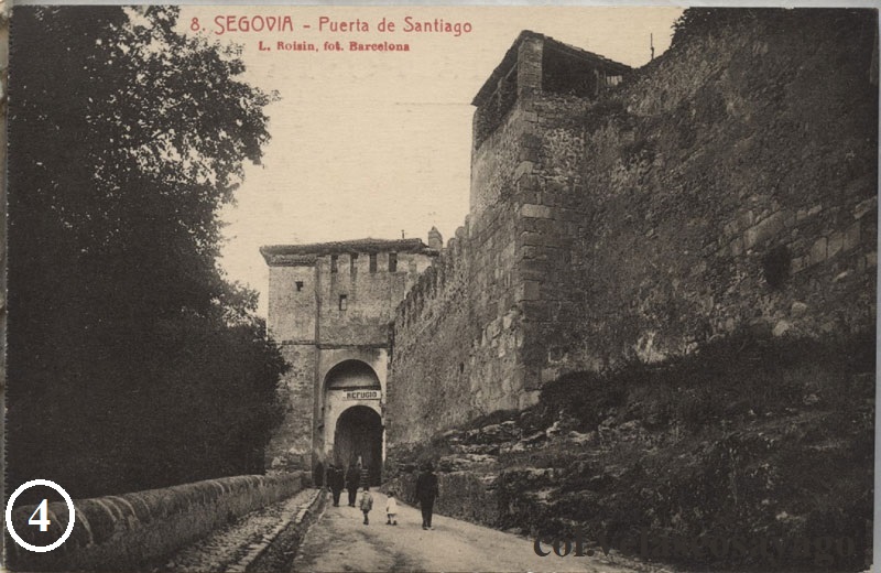 4: La colección segoviana del fotógrafo Lucien Roisin, compuesta de 36 tarjetas, dedica la nº 8 a la ‘Puerta de Santiago’. Edición años 20.