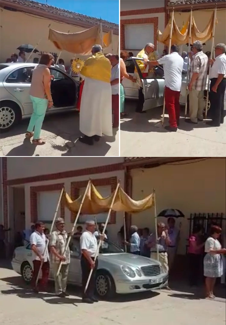 Ante el trance de suspender la procesión, los vecinos improvisan y suben al sacerdote y la custodia en un moderno Mercedes. Ni cortos ni perezosos, los cofrades del palio se colocan junto al vehículo y es así, en Mercedes bajo palio, como termina la ajetreada procesión. Nótese que el piloto no se anda con chiquitas y a los portadores del palio les cuesta seguir el ritmo. En fín. Sin duda, una de las imágenes más sorprendentes del año. “Las nuevas tecnologías”, comenta irónica la anónima autora.