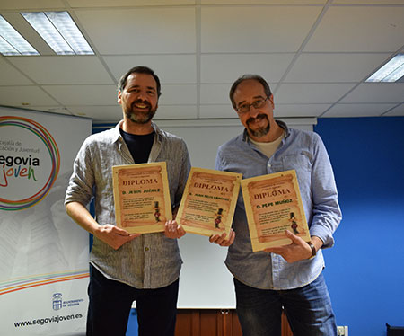 Bonito homenaje de una treintena de alumnos del IES Giner de los Ríos a los profesores José Muñoz Domínguez y Jesús Juárez Alcalde. En secreto, los alumnos organizaron el acto en la Casa Joven el pasado 25 de marzo en reconocimento al trabajo de ambos docentes en la motivación de los escolares para emprender trabajos de investigación en el bachillerato. Tanto José Muñoz como Jesús Juárez compaginaron desde el año 2007 sus labores docentes con la elaboración de los trabajos para el concurso de la Fundación Patrimonio denominado “Nueve Secretos”, ahora conocido como “Patrimonio Joven”. Alumnos de Bachillerato trabajaban durante el curso académico en grupos de máximo diez personas para elaborar un trabajo de investigación de un bien de interés cultural (BIC) de la provincia de Segovia, pasando por el pasado, presente y una propuesta de futuro para el BIC.