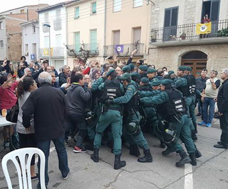 No tienes poder coercitivo, entonces lo primero es que tampoco lo tenga el oponente. Para eso está la Assamblea Nacional de Catalunya, una entidad surgida hace siete años y que hoy es capaz de movilizar a varios centenares de miles de pacíficos ciudadanos (no pistoleros ni ultras del fútbol, tipos normales de clase media, como usted o como yo). Siguiendo las teorías del jiu-jiutsi político (no es coña) del filósofo setentero Gene Sharp, lo que toca es buscar la desobediencia masiva. Diseñar pautas de boicot, interponer masas frente a la acción policial, caceroladas, manifestaciónes absolutamente no-violentas, huelgas… Está todo inventado.