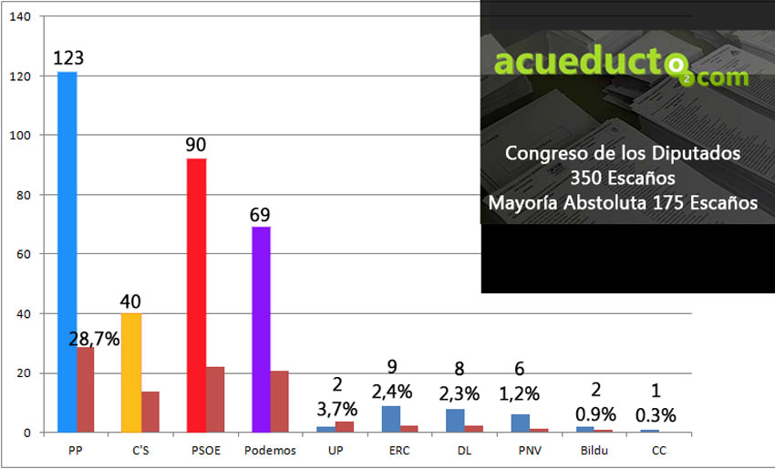 El PP ha ganado las elecciones en España tanto en el Congreso y en el Senado, donde repite una amplia mayoría absoluta, pero los magros 123 escaños de las Cortes desahucian a Rajoy de la Moncloa. Los liberales de Ciudadanos han pinchado respecto a sus previsiones, sus 40 escaños no le valen al centro-derecha. Podemos (la fueza triunfadora de la noche, si es que cabe hablar en tales términos) y sus diferentes franquicias suman 69 diputados, por 90 el PSOE. Unidad Popular logra dos meritorios e importantes escaños, y el resto es para los nacionalistas, nuevamente con la llave de las mayorías.