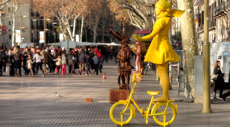 Ya de muy crío sentías esa expansión vital en la Rambla de las Flores y sus quioscos cargados de diarios de todos los países; luego venía la dels Ocells (o mixons, como le llámabamos los paletos del Oeste) con sus pajarerías, la última de las cuales cerró hace cuatro años. Más allá del Liceu y el café de la Òpera empezaba la Barcelona portuaria, con aquel mostrador abierto en medio de una pared y flanqueado por ruinas humanas, “absenta” se leía en un cartelucho hecho a mano. Seguías hacia Colón, a ver un trocito de mar de chocolate batido por las golondrinas, pasando por delante de turbias y estrechas bocacalles. En las cercanías del café Ambos Mundos los paisanos te enseñaban los huecos esculpidos en el suelo de mármol de un portal. Las huellas que dejaron décadas de putas distrayendo el frío húmedo a taconazos. De Canaletas al Port Vell, en los laterales, no hace tanto se amontonaban los peores restaurante para guiris que yo haya visto jamás. Tortillas de patatas con lágrimas de salmonelosis. pizzas de Tranchetes y gazpacho de tomate frito. En las casas, desvencijados letreros de negocios improbables. Los chiringuitos de recuerdos eran un batiburrillo de muñequitas andaluzas, toreros de terciopelo, espadas del Cid y, no se sabe porqué, sombreros mejicanos. Hoy la Rambla es ya otra cosa; franquicias de alimentación con carta en mil idiomas, elegantes tiendas de souvenirs con gadgets gaudinianos, dragones y Barça Corner por doquier: Mesís a cien pavos. Los hombres estatua de los 90, yonkis tembloros con una sábana y la cara pintada con ceras Dacs, han dado paso a artistas de la inmovilidad que cotizan como Autónomos. Lo cutre del siglo XX es en el XXI un cutrelux para cruceristas, que no sé si es peor, pero es desde luego mucho más limpio.
