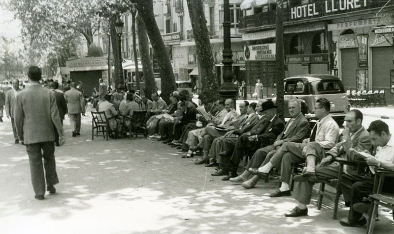 En los 90 estudie en la vieja escuela de idiomas, trabaje un tiempo en Pelai. Al salir del curro me iba derecho al Glaciar, a la Òpera, contento como un cascabel y fascinado por la maraña humana. Senyeres revueltas con capotes de lidia, Aromes de Montserrat y Jerez Osborne. Cuponeros de la ONCE y vendedores de todo lo demás escondidos en los portales. Rambleaba atento al nota de turno, al guiri borracho montando el pollo, a los moros mirándole la cartera asomada al bolsillo del pantalón. Guitarristas ingleses berreando a lo punk, viejos alimentando palomas. Boixos Nois de resaca tras celebrar un triunfo del Barça. Gente normal, miles. Y los que forman parte del paisaje, Jaumes Sisas saliendo de un tugurio de spanish croquets al empezar o al acabar de una de sus interminables farras. Periodistas de La Vanguardia. Gitanos del Raval, “pakis” de la calle Hospital. Hoy ha cambiado, claro. Pero el espíritu ahí está. Se huele. Los visitantes no van de Cataluña a Colón por el Gótic, y mira que es más bonito. Siempre por la Rambla.