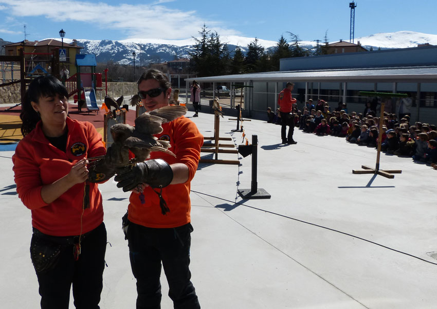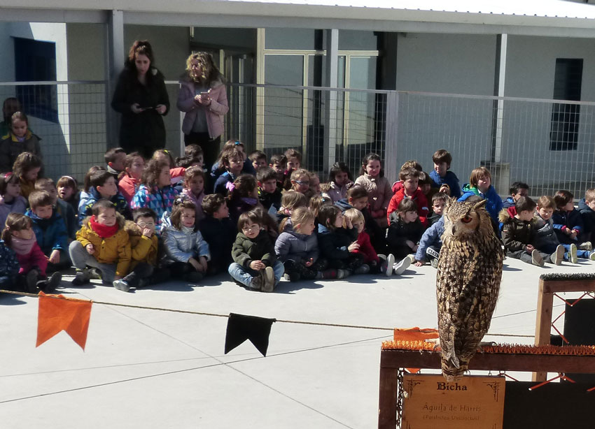 Sorprendentes compañeros de patio para los rapaces de infantil del CEIP Atalaya en Palazuelos de Eresma. A la hora del recreo, fueron privilegiados espectadores de una demostración de cetrería a cargo de Halconeros de Castilla. Carabos, lechuzas, buhos, halcones y águilas de Harris compartiendo patio. La iniciativa formaba parte de dos proyectos didácticos en los que han trabajado los párvulos, la noche y los castillos. Así que los cetreros les explicaron entre vuelo y vuelo cómo son las rapaces nocturnos y como los señores medievales usaban los halcones para cazar.