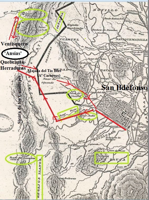 Tras descansar en la Fuente de los Pastores, se desvían por el Cuartel de los Llanos de la Cantera hacia la vereda de Quebranta Herraduras, accediendo por la majada del Tío Blas, paralelos al arroyo Carneros.