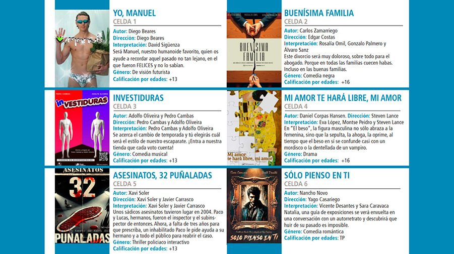 Las celdas del centro se convertirán en escenario de seis piezas teatrales breves que se representarán bajo el formato 15-15-15: quince minutos de duración, para un máximo de quince espectadores, en un espacio de quince metros cuadrados. Los títulos programados son: “Asesinatos, 32 puñaladas”, “Solo pienso en ti”, “Investiduras”, “Mi amor te hará libre, mi amor”, “Yo, Manuel” y “Buenísima familia”.