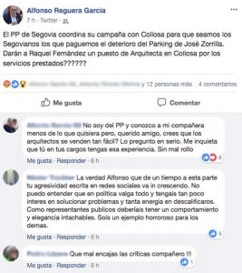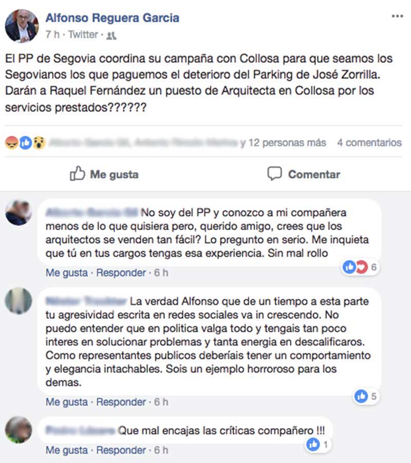 Reguera, mucho más agresivo, ha elevado en sus perfiles a afirmación rotunda la acusación aunque en el texto no se aclara si tiene alguna prueba que afiance lo escrito, mientras que varios usuarios hicieron comentarios de reprobación a sus afirmaciones en el mismo muro. Se da la circunstancia de que el mismo portavoz invitó hace unos días a dimitir al líder municipal de Centrados en Segovia, Cosme Aranguren, por un comentario crítico, también en redes sociales, hacia el dirigente de Podemos, Pablo Echenique.