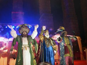 Todo listo para que el sábado 5 de enero Melchor, Gaspar y Baltasar puedan ser agasajados como se merecen por los niños y mayores segovianos. En la capital, el real séquito, precedido por el astrólogo Eliazar y escoltado por el grupo francés de animación Aero Sculputure y 400 voluntarios, se concentrará a las 19:00 frente al Alcázar de Segovia, donde se procederá al habitual espectáculo pirotécnico, con salida de la cabalgata sobre las 19:30. De ahí Sus Majestades recorrerán el itinerario habitual por las calles Daoiz y Marqués del Arco, hasta la plaza Mayor, siguiendo por San Agustín, estrenando la cuesta de San Juan para terminar en el Azoguejo,  donde los reyes se sentarán en los tronos para dar audiencia a los miles de niños y contrastar la conducta verificada a lo largo del año en consonancia con los informes redactados por los pajes regios.