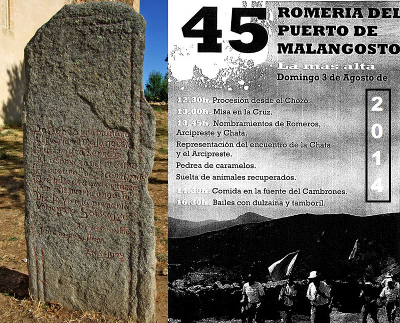 Monolito en recuerdo del Arcipreste de Hita en Sotosalbos y cartel de la 45 romería de ‘Malangosto’.
