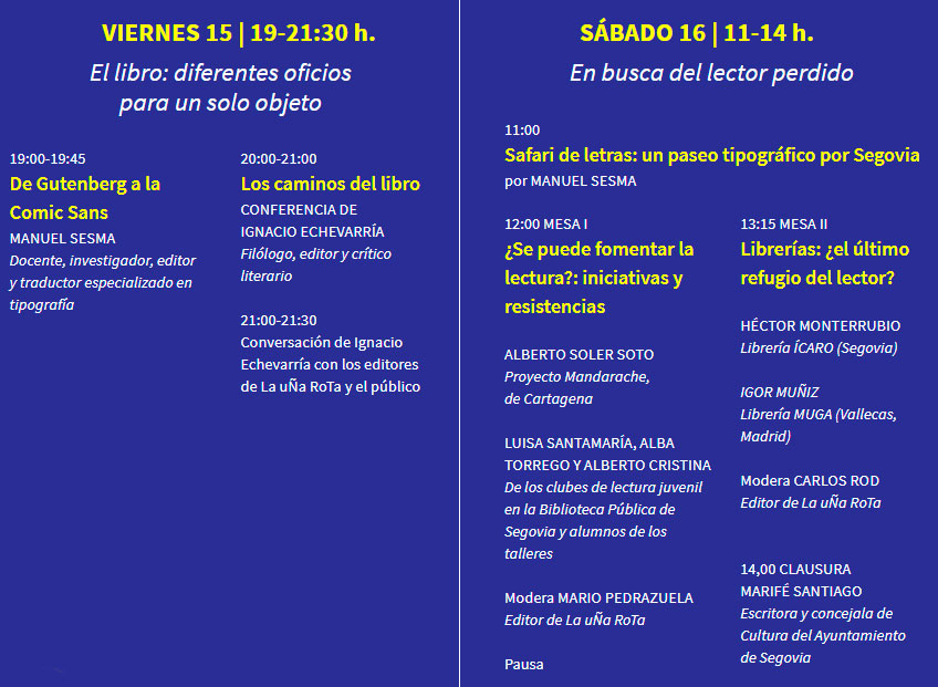 De la Calle Real conocemos sus casas nobles, los esgrafiados, su historia y leyendas. El sábado 16 de diciembre conoceremos además sus letras, a través de las diferentes tipografías de los establecimientos. Toda una clase en vivo, o safari tipográfico, a cargo del diseñador segoviano, Manuel Sesma. Ediciones la Uña Rota, en colaboración con el Ayuntamiento de Segovia y la Casa de la Lectura, organiza para el fin de semana la segunda edición de Inéditas, que incluye la reseñada visita guiada. El propio Sesma dará inicio a las jornadas el viernes 15 con una charla sobre el mágico mundo de las letras, seguida de una conferencia a cargo de Ignacio Echevarria. Para el sábado, y tras el paseo y en la Casa de la Lectura, dos mesas redodnas sobre el fomento de la lectura y el futuro de las librerías.