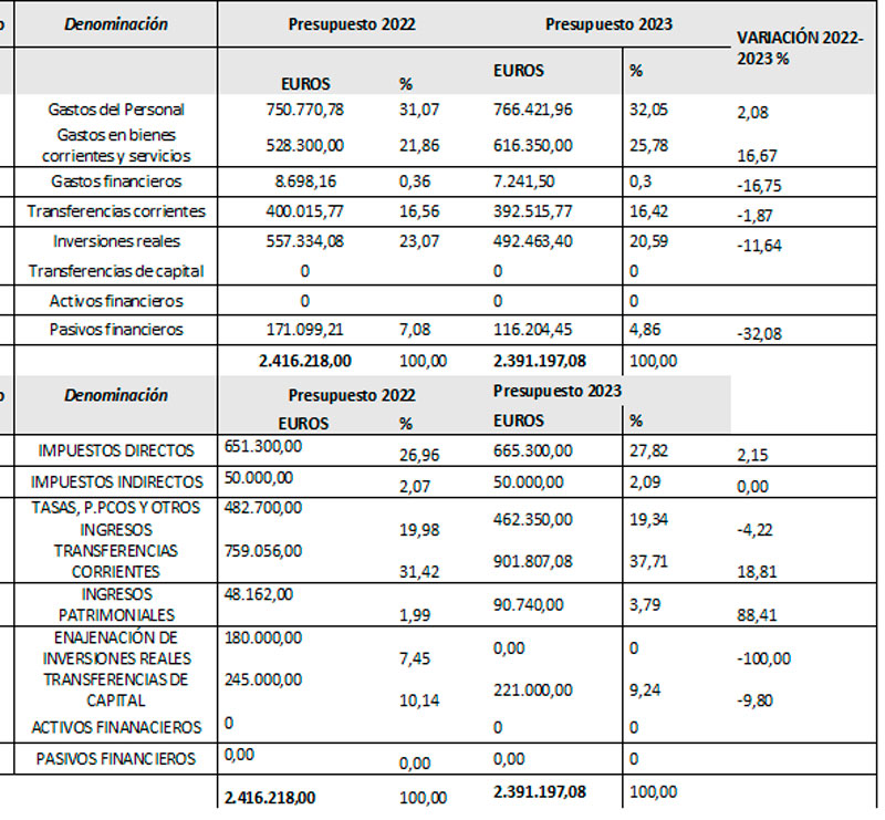 En total, el municipio invertirá este años 492.000€, el 21% de su presupuesto, destacando además de la dotación de energía limpia, otros 50.000€ que se destinarán a finalizar la cubierta de la pista deportiva, que con las subidas de las materias primas quedó sin ejecutar en el ejercicio 2022, así como el mobiliario de los centros de personas mayores y centro juvenil para ampliar servicios al vecindario y en especial a mayores y jóvenes.