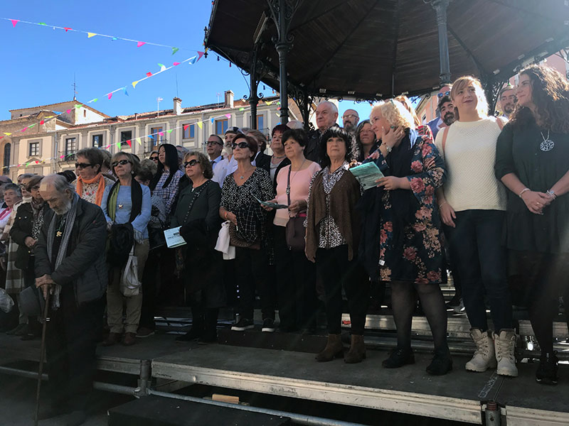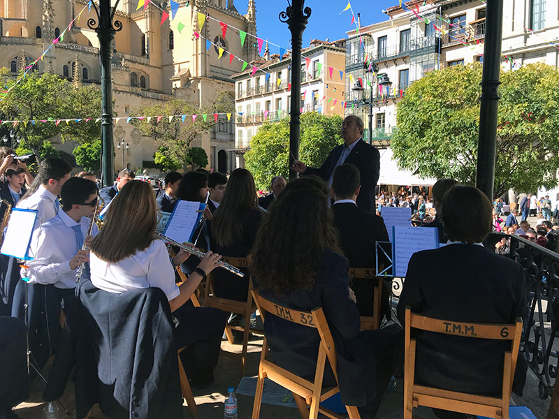 Y otra vez a cantar en grupo. Esta ven en el estrado montado ante el quiosco, con la alcaldesa Luquero en el centro y unos cincuenta segovianos más, además de los que se arremolinaban por allí, para interpretar el Himno a Segovia —la pieza gusta más a algunos que a otros, pero a fecha de hoy es nuestra canción— bajo la batuta de Francisco Cabanillas.