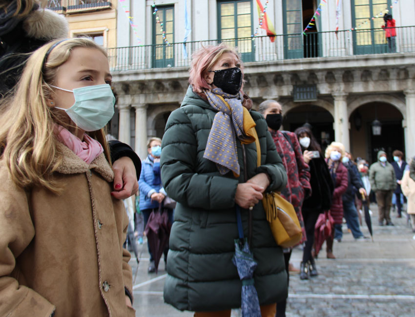 Pese a todo, y en un intento para que el coronavirus no nos lo quite todo, unos centenares de segovianos se congregaban el 25 de octubre y en la plaza para cantar al alimón el villancico al santo y el himno a Segovia, bajo la batuta de Francisco Cabanillas y la Unión Musical Segoviana marcando el compás. Dos niñas de la ecolanía segoviana –Leyre Matesanz y Cloe Baeza– abordando a dúo la pieza del solista, valga la paradoja. Lo bordaron.