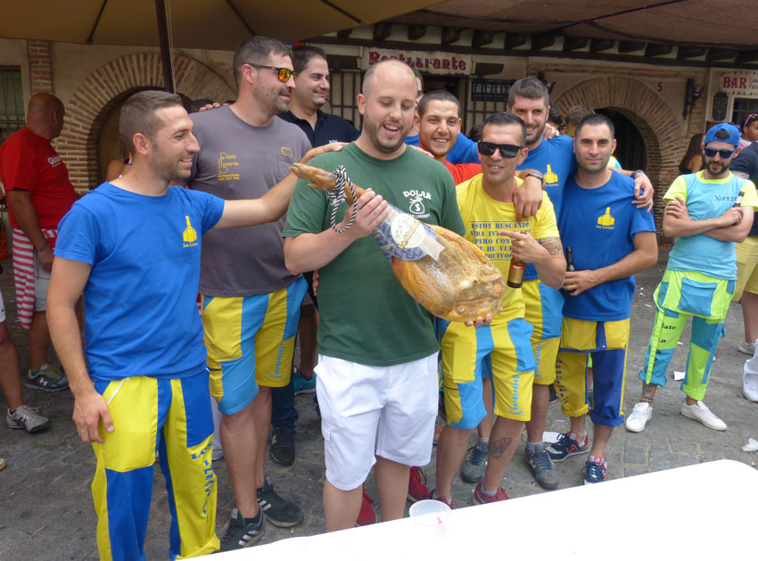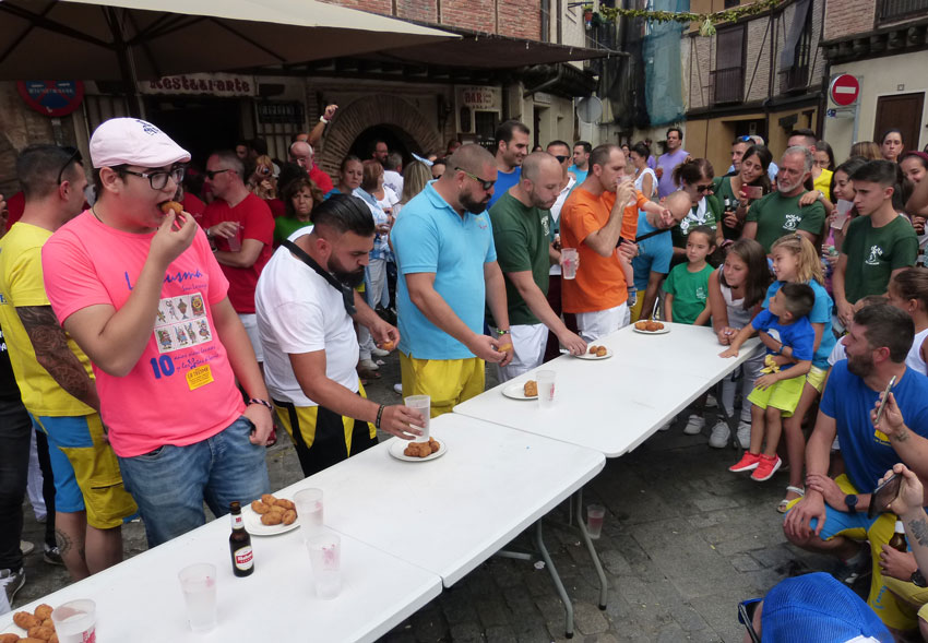 El que sujeta “la bandurria” se llama Andrés Martín y ni se les ocurra invitarle a croquetas. 26 de jamón y de las recias en algo menos de tres minutos, a siete segundos por pieza, devoró este representante de la peña El Dólar en la competición de comer croquetas de las segovianas fiestas de San Lorenzo. Campeón indiscutible, Andrés se impuso en la final a Alberto “Buba” de Miguel, y además por paliza. Dos técnicas enfrentadas; Buba, trasegaba media croqueta con meticulosidad, tragaba y luego a por la otra mitad. Un ritmo de fondista condenado de antemano ante la estrategia de velocista del campeón, basada en el engullimiento de la pieza entera, trago de agua, engullimiento de la siguiente, y así hasta vaciar el plato. De premio, el jamón, para rematar el gusanillo.