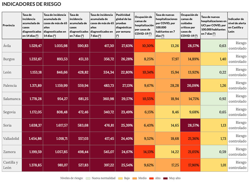 Con esos números en bajada, también la tasa de incidencia en dos semanas aparece encaminada a guarismos de tres cifras, pero aún en 1.172 casos por cada 100.000 habitantes en el conjunto de la región (1.378,85 casos) que, no obstante, es la segunda más baja del territorio, sólo mejorada por la de León (1.153,18).