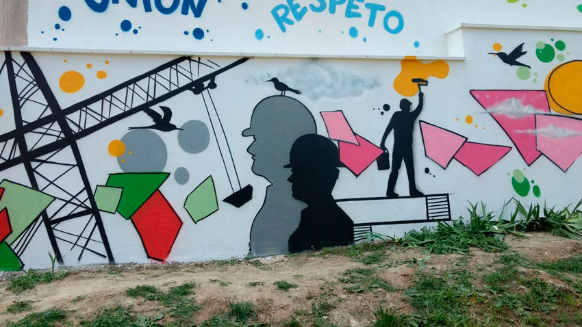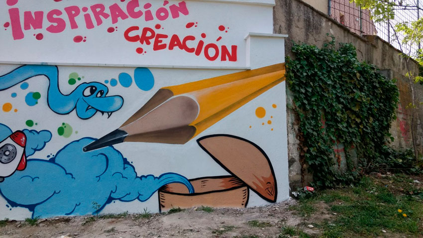 En el primer caso, la iniciativa parte de la dirección del centro educativo segoviano. Al objeto de animar y dar color a las paredes de la escuela se organizó un concurso entre el alumnado, los dibujos más votados se pasaron a grafiti a cargo de Rubio, que contó con la ayuda puntual de los propios alumnos del centro.