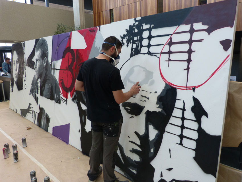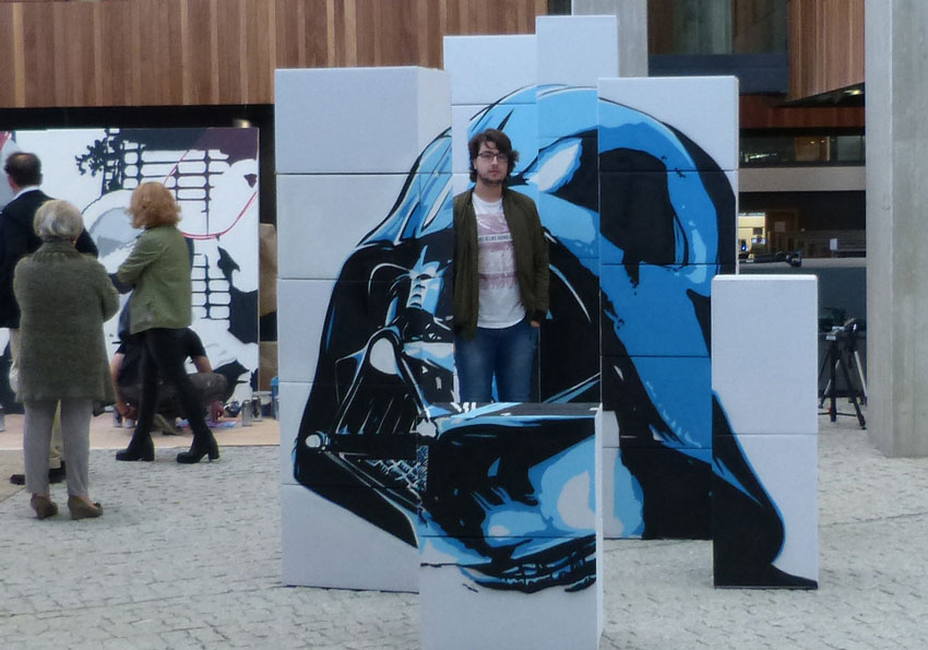 En el María Zambrano se desarrolló un prólogo de la exposición que basada en el grafiti, ocupará la sala de exposiciones del campus hasta el 20 de mayo. En este caso los artistas son la empresa segoviana especializada en decoraciones de arte urbano que elaboró en vivo -lifepainting- un mural basado en el cine y una creación anamórfica, es decir, pintura distorsionada que cobra forma en función de la perspectiva.