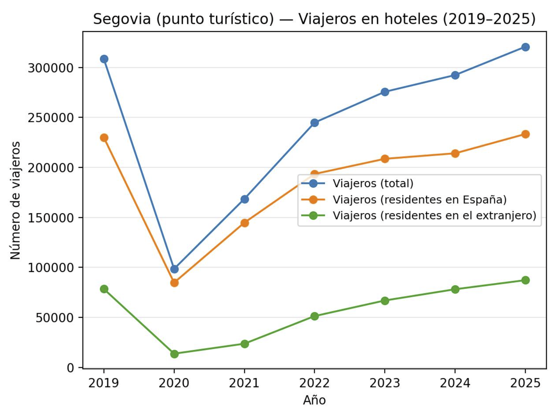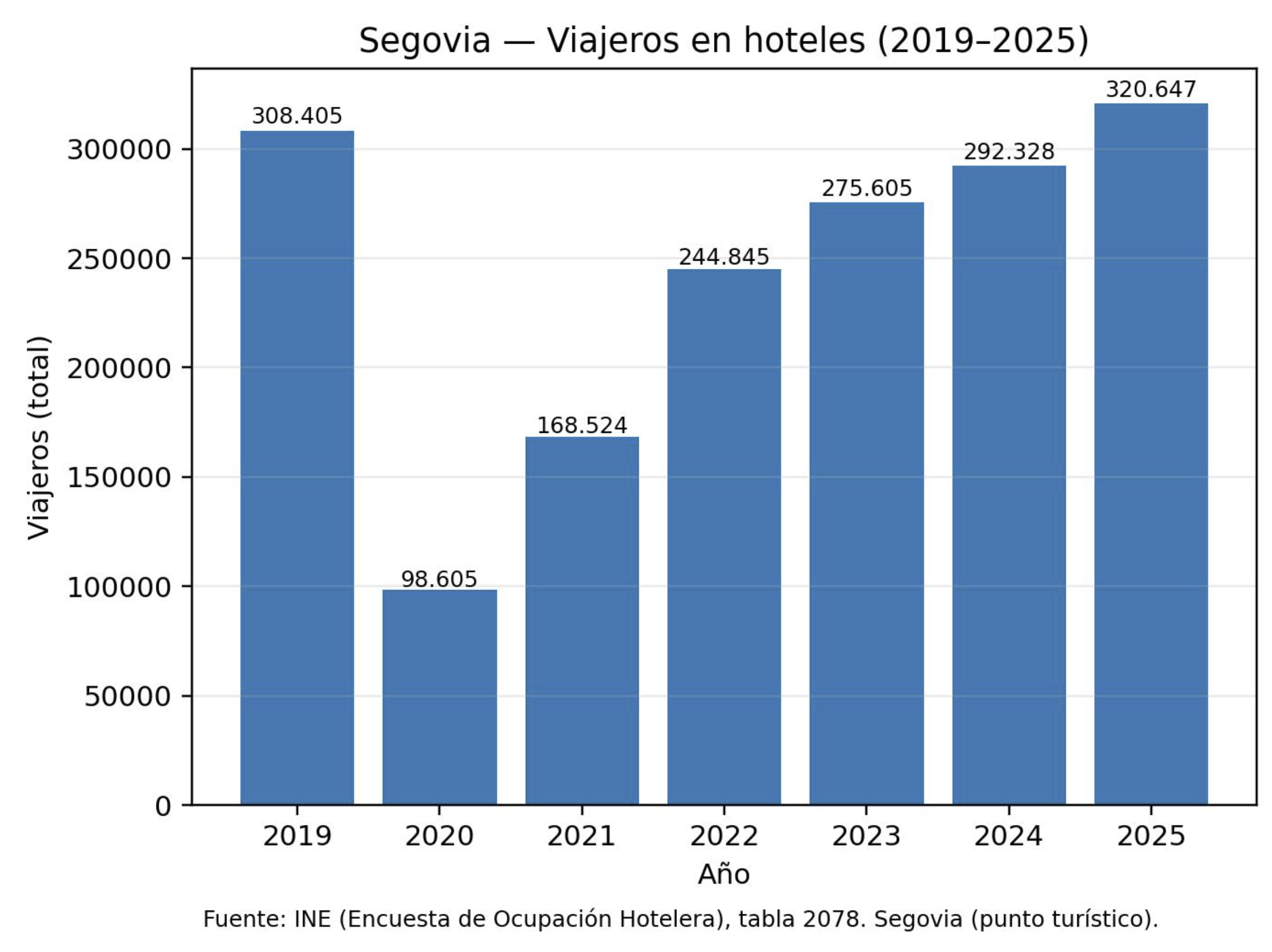 El Instituto Nacional de Estadística (INE) ha publicado los datos de la Encuesta de ocupación hotelera correspondientes al mes de diciembre de 2025, lo que permite cerrar el balance anual y confirmar que Segovia ha vivido el mejor año turístico de su historia en términos de volumen de visitantes que pernoctan en la ciudad.