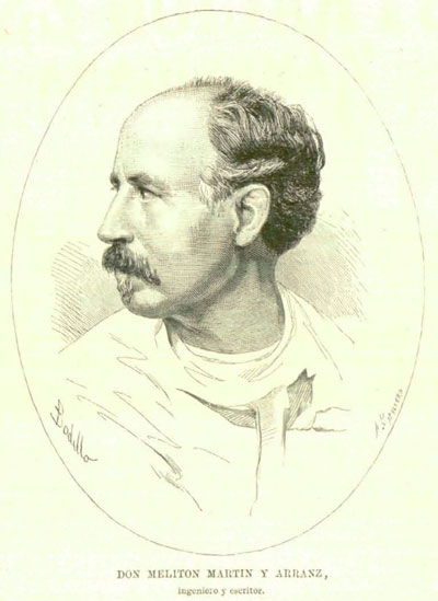 Melitón Martín y Arranz nació en Segovia en 1820 y murió en Madrid en 1886. Estudió ingeniería en Londres a donde se trasladó su familia. A su regreso a nuestro país no le convalidaron su titulación extranjera. Su conocimiento de inglés, francés, italiano y alemán le permitirían ocupar un puesto ministerial durante 5 años.