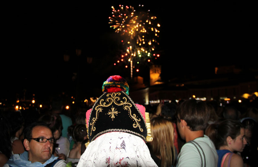 Pregón lanzado, alcaldesa y deportistas aproximaron un cigarro a la mecha de un "cuete" -así dijo el maestro Matesanz, en casticísima expresión- y empezaron los fuegos, este año sincronizados con el Hinmo a Segovia, como homenaje al reciente fallecimiento del director Héctor Guerrero, responsable de la primera grabación del "Voces de gesta, la historia canta..."