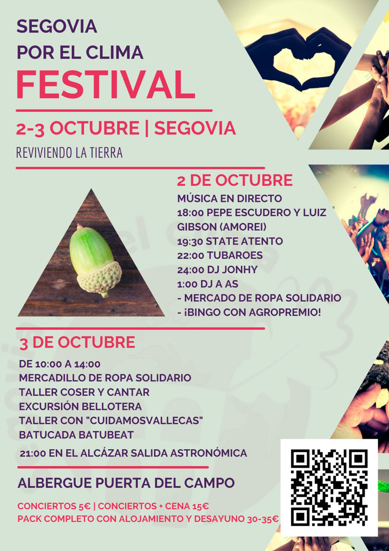 Serán los días 2 y 3 de octubre, en la granja-escuela de Robledo (Real Sitio de San Ildefonso), Albergue Puerta del Campo, con entrada mínima de 5€ para acceder a conciertos y actividades, y máxima de 35€ (alojamiento y comida para los dos días), todo a beneficio de Segovia por el clima. Es el festival Bellotero, que organizado por la la entidad promete un sábado lleno de música en directo, con taller de costura y aprovechamiento de retales, bingo con “agropremio” y mercado solidario de ropa de segunda mano, mercado que volverá a abrir el domingo, junto con más talleres, una excursión “bellotera”, para diseminar masivamente estas semillas y fin de festival en el Alcázar, con una salida astronómica.