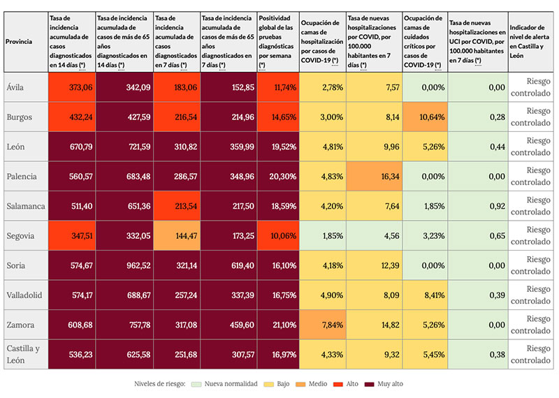 En cuanto a la incidencia de la enfermedad, se mantienen los niveles en guarismos elevados aunque la mejor noticia es que los datos facilitados por Sanidad sitúan a Segovia en los puestos más bajos de la comunidad en cuanto a los indicadores de riesgo. De hecho, la provincia tiene una tasa de 347,51 casos por cada 100.000 habitantes en dos semanas, 43 puntos menos que el viernes, última fecha en la que se facilitaron datos, manteniéndose en la zona de “riesgo alto” (entre 300 y 500 casos), en la que también están Ávila y Burgos. El resto de las provincias están en “riesgo muy alto”, al igual que la media de Castilla y León, que hoy alcanza los 536,23 casos.