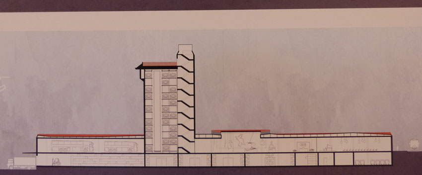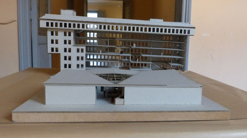 Maqueta con la distribución interior de la torre de secado. Arriba, proyecto para conversión en centro logístico.