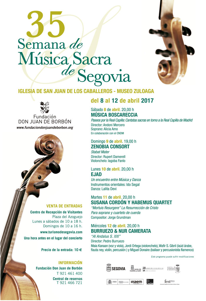 La Semana de Música Sacra de Segovia, del 8 al 12 de abril, celebra su 35 edición, para lo cual la Fundación Juan de Borbón, organizadora del evento, ha programado conciertos de diferentes momentos y lugares del mundo, desde la India, con Ejad, a la música contemporánea (Habemus Quartet), las cantatas sacras o la tradición del Zenobia Concert. Cierra el ciclo el gran Pedro Burruezo, fundador de Claustrofobia, con su última aventura con Nur Camerata.