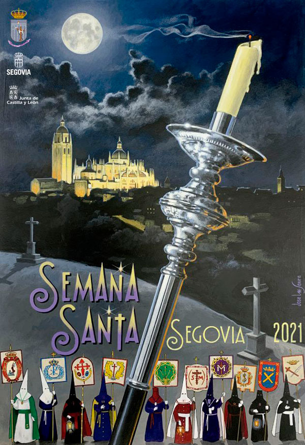 Tradicionalmente, el cartel de la Semana Santa surgía de la foto ganadora del concurso a tal fin organizado en el año anterior. Como no hubo ha habido que tirar del buen hacer del ilustrador José Luis López Saura, homenaje a los cofrades fallecidos y que es una vista crepuscular de la Catedral. Al pie, las 10 cofradías segovianas con sus estandartes y en primer plano un candelero con la vela apagada, metáfora de los que ya no volverán.