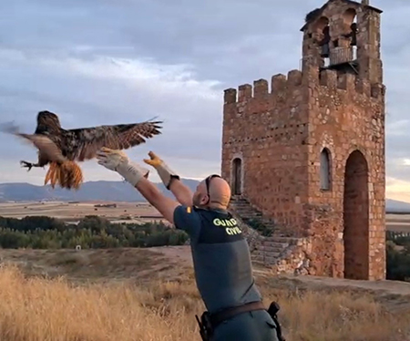 La Guardia Civil de Segovia, a través de la Patrulla del Servicio de Protección de la Naturaleza de Ayllón, ha intervenido en la recuperación de un ejemplar de Búho Real (Bubo bubo) que se encontraba atrapado en el patio interior de un edificio de esta localidad.