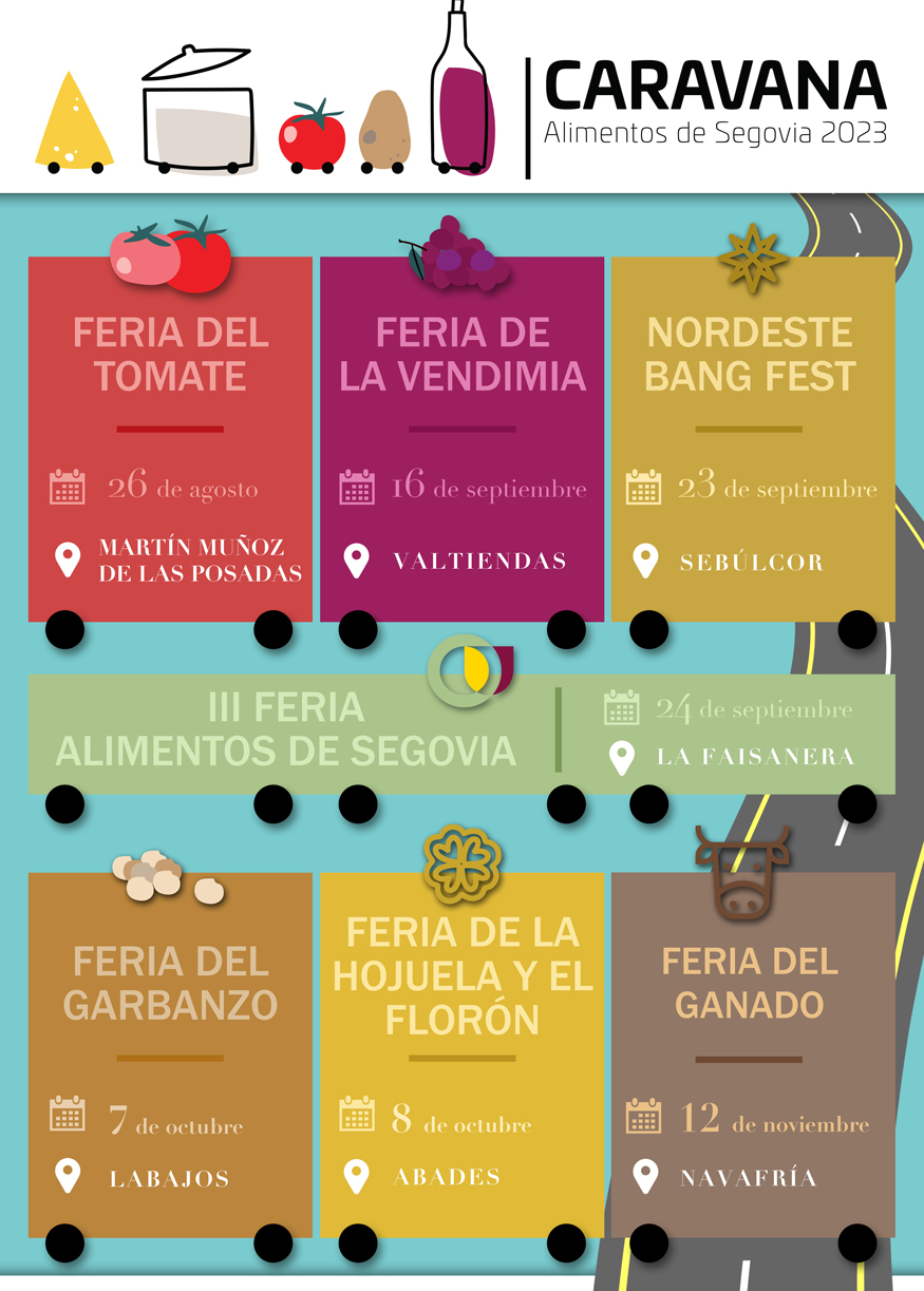 La promoicón de Alimentos de Segovia alargará el verano hasta finales de septiembre con su presencia en el Nordeste Bang Fest de Sebúlcor el 23 de septiembre y, un día después el 24, con la celebración de la tercera edición de la gran Feria de Alimentos de Segovia, en la La Faisanera Golf. A continuación está previsto seguir empujando “vagones”, a la Feria del Garbanzo de Labajos el 7 de octubre, la Feria de la Hojuela y el Florón de Abades del 8 de octubre y la Feria del Ganado de Navafría el 12 de noviembre.