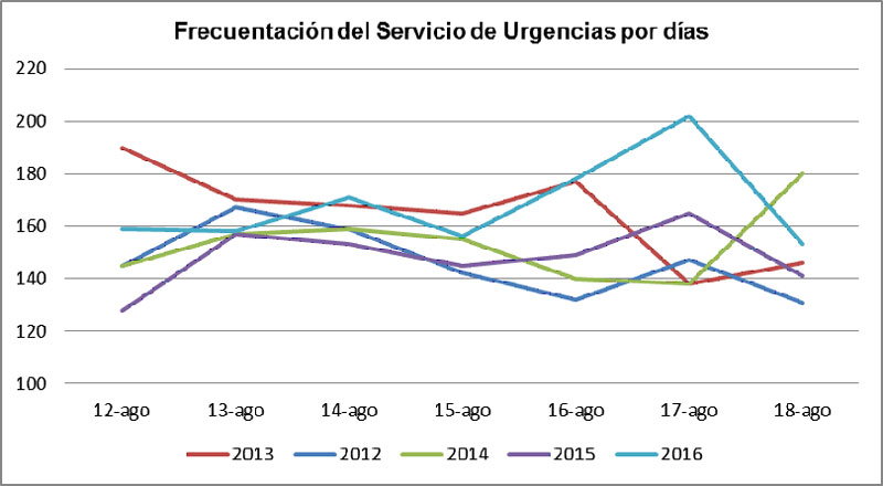 Analizando la frencuentación del servicio en la semana del 12 al 18 de agosto (que coincide con la que Hidalgo denunció como de máxima saturación del servicio), se percibe que efectivamente el 16 de agosto se batió un récord, con 202 pacientes atendidos, frente al anterior registro, 190 en 2013, con todo, los niveles volvieron a estabilizarse, de donde las medias de los últimos años son “parecidas o con un leve incremento al alza”.