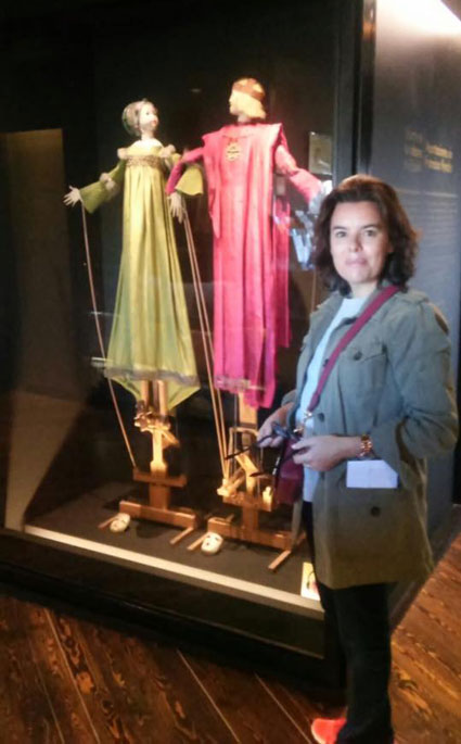 Soraya, en una reciente visita a Segovia, donde posó en la puerta de Santiago junto a la colección de titéres de Peralta.