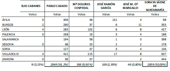 En el conjunto nacional, Soraya Sáenz de Santamaría obtuvo el 36% de los votos (21.523 sufragios) por el 34% de Casado (19.967). Cospedal, apoyada en Segovia por Silvia Clemente y Beatriz Escudero —las únicas que mostraron públicamente sus preferencias durante la campaña— se ha quedado con el 26% (15.090), el resto de candidatos José Manuel García Margallo (680), José Ramón García Hernández (668) y Elio Cabanes (185) no llegaron al 2% de los sufragios.