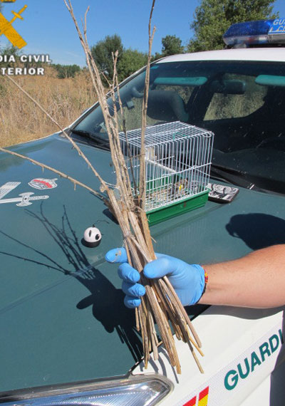 Una patrulla del Seprona de Segovia sorprendió cazando jilgueros a dos hombres en un paraje de Torredondo (Segovia). Estaban utilizando varillas impregnadas en liga -especie de pegamento- , instaladas a modo de trampas en diferentes arbustos y a las que acudían los pájaros atraídos por el reclamo sonoro que reproducían los investigados desde sus teléfonos móviles, y que a su vez estaban conectados a un altavoz auxiliar para potenciar el canto de reclamo. Además disponían de una jaula pajarera con un ejemplar vivo de jilguero que pudo ser recuperado con vida para su futura puesta en libertad.