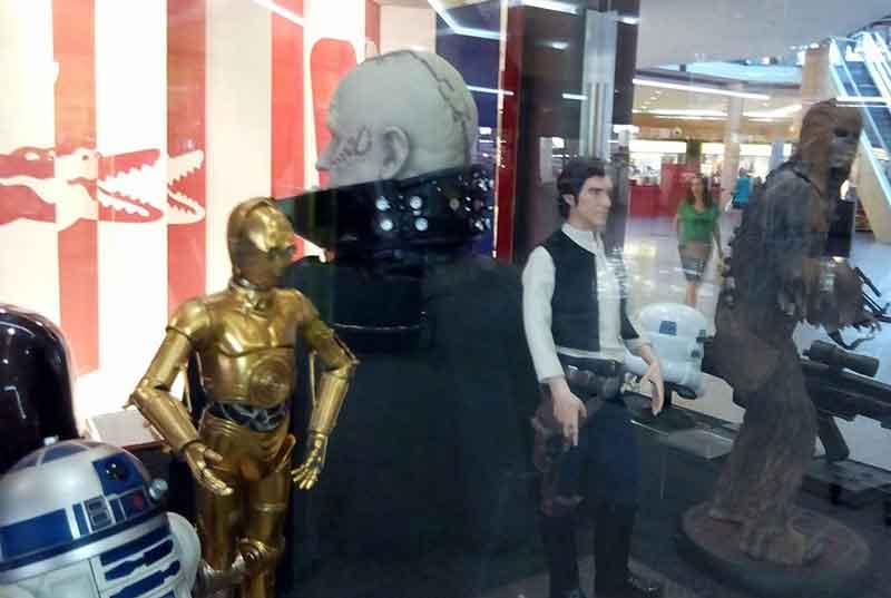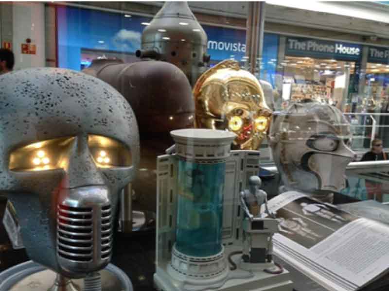 Demuestra lo qué sabes de la Guerra de las Galaxias. Hasta el 25 de julio, el centro comercial Luz de Castilla expone en 18 vitrinas una colección de maquetas, gadgets originales, espadas-láser y toda la parafernalia hija de la popular hexalogía creada por George Lucas en 1977, próximamente, hepta, a tenor del esperado estreno de la séptima entrega de la saga, previsto para diciembre de 2015 (El Despertar de la Fuerza, dirigida por J.J. Abrams, ambientada 30 años después de que Darth Vader y el Emperador acabasen achcicharrados en un reactor de la Estrella de la Muerte).