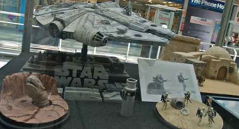 Mitos de una galaxia muy lejana, que así se llama la exposición, exhibe piezas de tirada muy limitada y en algunos casos, del propio rodaje de las diferentes entregas, entre las que destaca una réplica del casco original de Darth Vader en La venganza de los Sith firmado por el actor, Hayden Christensen; o un diorama que representa el Halcón Milenario, sin duda de gran interés ya que está seccionado (se puede ver su interior) y mide casi dos metros de largo, así como una vitrina con cabezas a tamaño real de los robots que aparecen en las películas. También se puede ver una máscara original de producción de un Ewok de El Retorno del Jedi, estatuas y figuras a tamaño real de un Sandtrooper; un Stormtrooper; el caza-recompensas más temido de la galaxia, Boba Fett; un Jawa, el maestro de Jedi Yoda; y a Han Solo en su “traje” de carbonita rumbo a Tatooine. Mención aparte merecen los autógrafos de los actores, storyboards originales de los episodios IV, V y VI, así como figuras del palacio de Jabba y un sinfín de estatuas, bustos, cascos y figuras, entre los que destacan grandes maquetas del Halcón Milenario.
