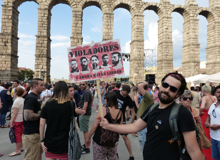 Siguiendo la ola de indignación que ha conmocionado España, casi 500 segovianos convergieron en la plaza del Azoguejo el 22 de junio para manifestar, entre el estupor y el cabreo, el rechazo a la decisión judicial que concede libertad provisional bajo fianza de 6000€ a los cinco condenados por violar a una joven en las fiestas de San Fermín, “la manada”.