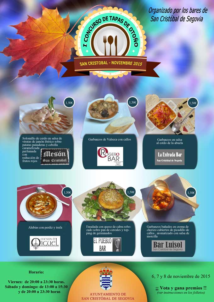 Tras haber realizado durante tres años el concurso de tapas de primavera, acaba de presentarse en San Cristóbal de Segovia la primera edición del Concurso de tapas de otoño. Del 6 al 8 de noviembre, seis bares de la localidad organizan la iniciativa con la colaboraicón del Ayuntamiento de San Cristóbal. Tres establecimientos han optado este año por el garbanzo. Solomillo, alubias con perdiz y ensaladas de queso de cabra son otras de las atractivas alternativas que completan las propuestas para este fin de semana.