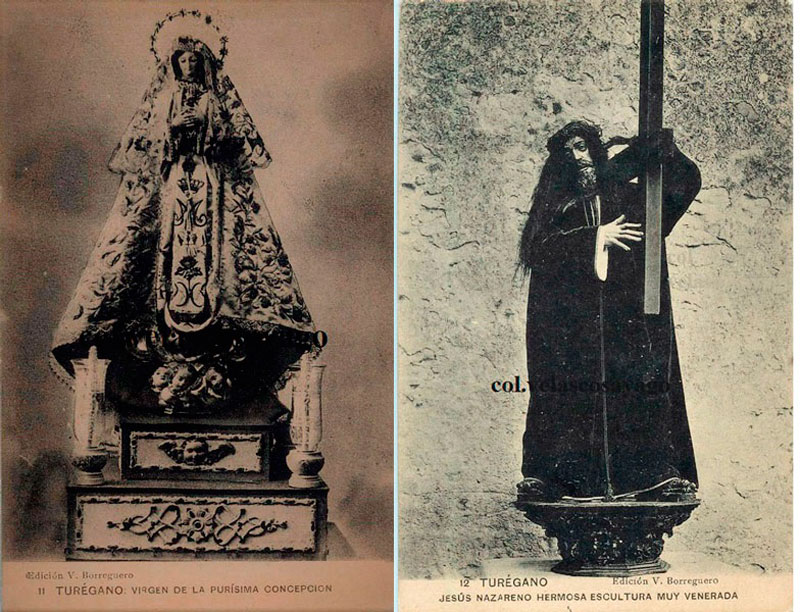 Como no podía ser de otra manera, encontramos dos cartulinas dedicadas a esculturas religiosas de la Purísima Concepción (11) y Jesús Nazareno (12), imagen muy venerada en la villa, como indica una de las postales.