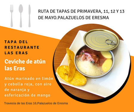 El ceviche de atún del Restaurante Las Eras ha sido el ganador de la edición 2018 de la Ruta de la Tapa de Primavera de Palazuelos de Eresma, celebrado el pasado fin de semana. Como el nombre indica, el plato ganador es un ceviche (maceración en frío) acompañado de aire de naranja y esferificaciones de mango, y que ha resultado el preferido en la votación popular. El ganador ha recibido su certificado y los lotes donados por Coca Cola y Mahou. En el acto, además se han sorteado entre las personas que votaron su tapa favorita cuatro lotes de productos de las empresas DYC y Jabones LU&JO, ambas de Palazuelos de Eresma.