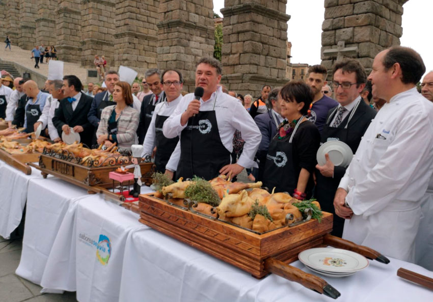 Por poco, pero la impresionante tormenta de última hora de la tarde del 24 de mayo no aguó la “Fiesta de Exaltación del cochinillo“, acto de clausura del Congreso de Turismo y Gastronomía organizado por la Asociación de Camareros de Segovia. Con la participación de 40 restaurantes, y bendiciendo la supermesa servida en el Azoguejo el gastrónomo Roberto Capone, se dieron a destazar al plato otros tantos cochinillos, con ración a tres euros para varios centenares de asistentes. “El cochinillo es parte de la bandera de España”, explicaba el chef, reivindicando el producto de calidad como centro de la buena cocina.