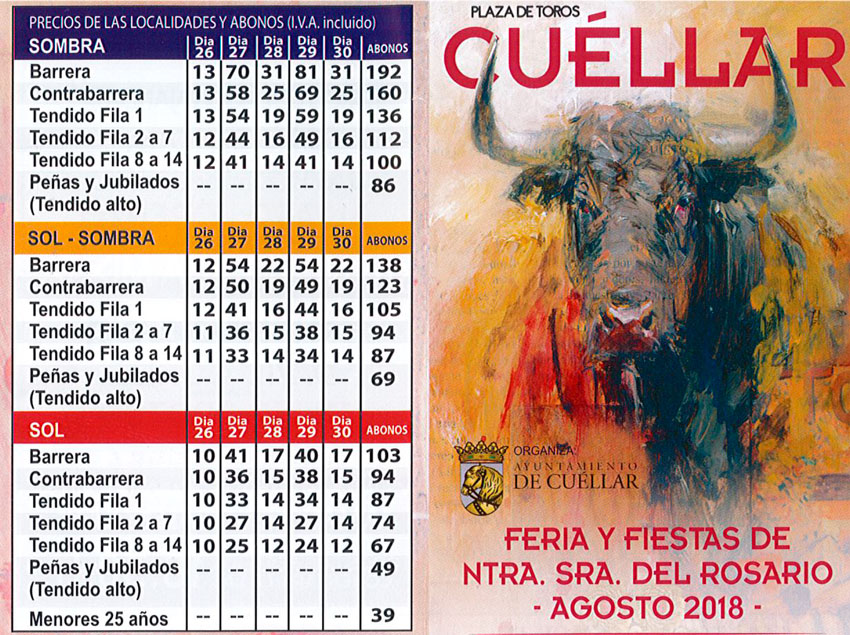 Precios populares de 24 a 80€ (barrera, para la corrida de toros) y abonos de 39 y 49 (menores de 25 años, y peñas y jubilados, respectivamente), hasta los 192€. La venta de abonos se desarrollará del 20 al 23 de agosto, y la de localidades sueltas a partir del 24 de agosto, de 10 a 14 horas y de 18 a 21 en la taquilla de la plaza de toros de Cuéllar.