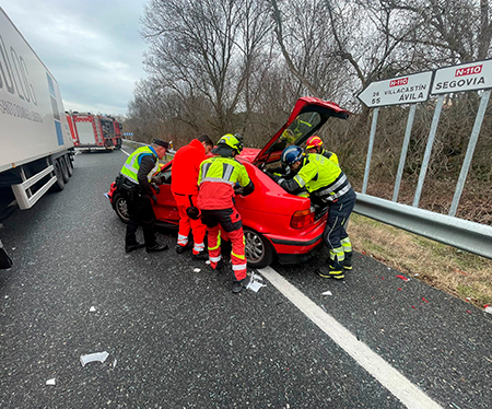 Por último, esta mañana, han acudido, a petición del 112, a un accidente de tráfico en el cruce de Madrona (zona competencial del Ayuntamiento de Segovia) en el que se han visto afectados un vehículo pesado y otro ligero, con dos personas implicadas, teniendo que ser rescatada una de ellas. Han sido los bomberos del Ayuntamiento de Segovia quienes han llevado la dirección del operativo, contando con la colaboración de un jefe de dotación y dos bomberos de la Diputación, desplazados al lugar con una bomba de rescate y vehículo de intervención rápida.